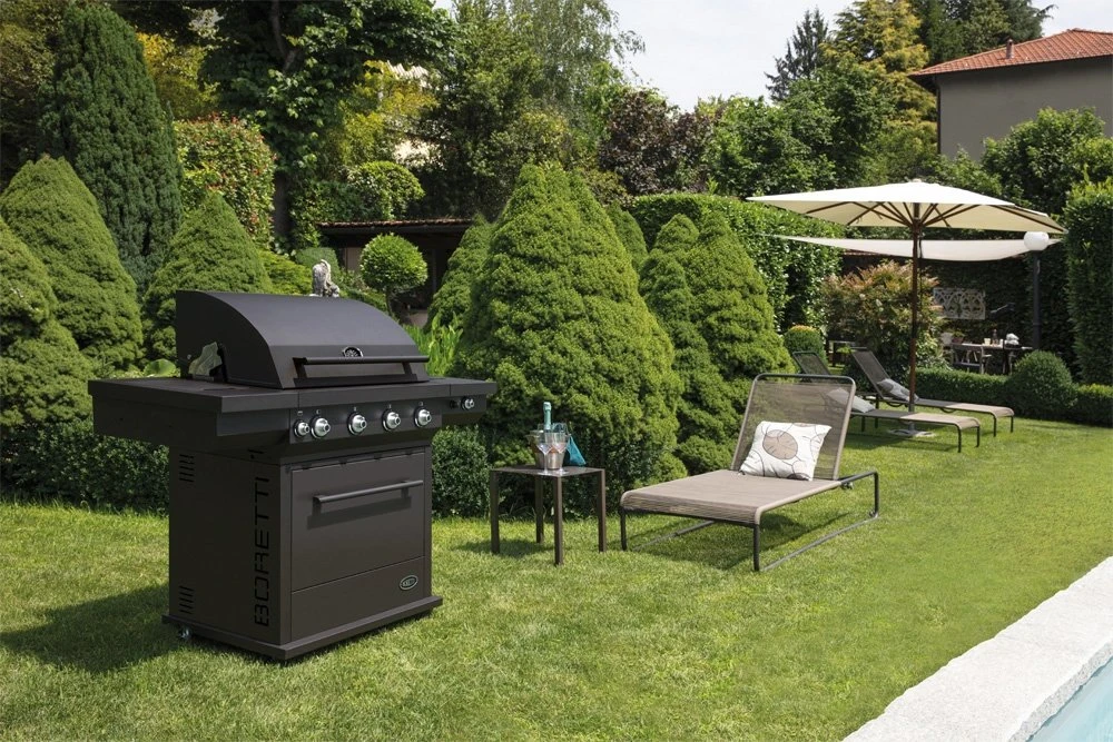 De Boretti Maggiore gasbarbecue lijkt qua design veel op onze bekende Boretti gasfornuizen. Deze outdoor kitchen is makkelijk te verplaatsen en heeft net als onze fornuizen Boretti bedieningsknoppen. De voorkant heeft een zwarte ‘ovendeur’, wat dient als handige opbergruimte. De Maggiore heeft drie hoofdbranders, een gas zijbrander en infrarood bodem- en achterbrander. Zo creëert u de perfecte garing voor ieder gerecht. Zoals bijna alle Boretti barbecues is ook deze uitgerust met twee gietijzeren grillroosters en een gietijzeren bakplaat. Binnenin is de Maggiore buitenkeuken uitgevoerd met een handig kruidenrek. Zo heeft u alles bij de hand om verschillende gerechten uit te proberen.