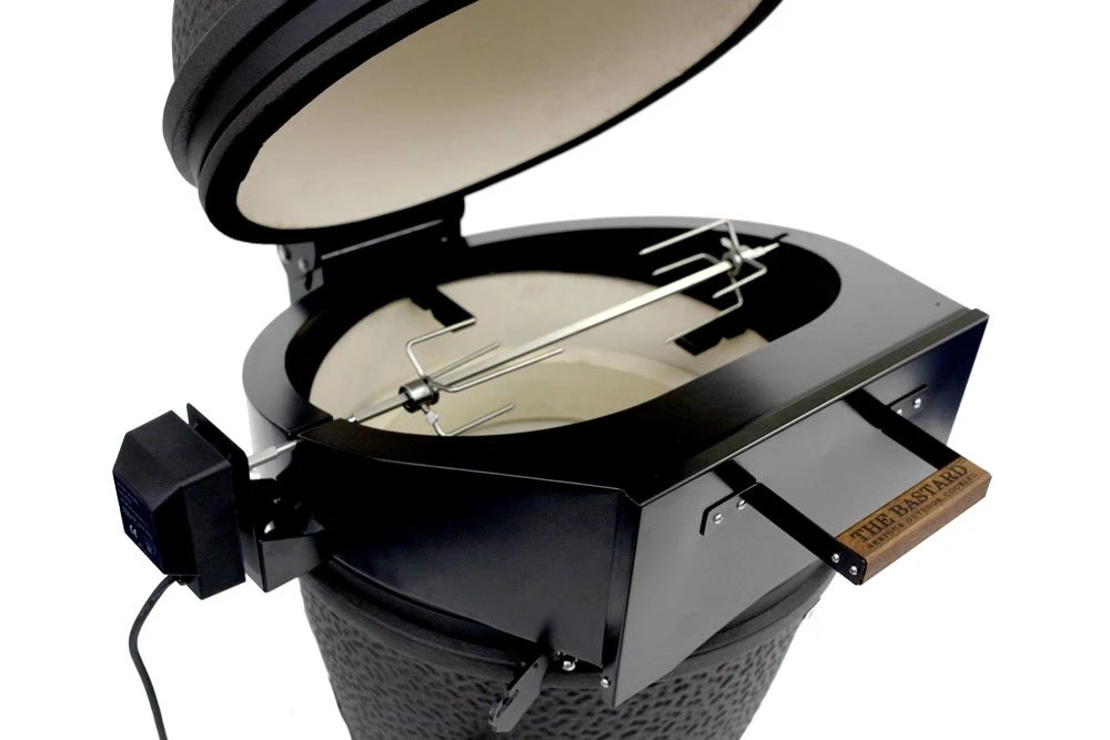Te gebruiken als rotisserie én als pizza oven. Door de handige deur aan de voorkant blijft de dome gesloten waardoor je het vuur op kan stoken en de warmte goed vasthoudt. De rotisserie oven wordt geleverd met een dikke pizzasteen op maat. Daarmee is het de ideale pizza accessoire voor jouw Bastard. Het demontabele draaispit heeft een sterke motor en grote klauwen.